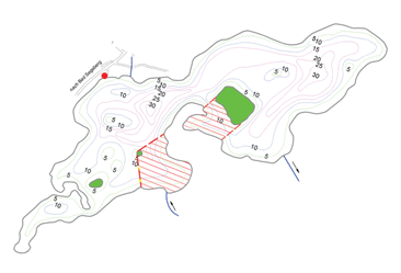 Durch Halbinseln im Osten gliedert sich der See in zwei ähnlich große Teile mit vielen Untiefen bis 30 m Tiefe. Sowohl nördlich als auch südlich dieser Halbinseln befindet sich jeweils ein Schutzgebiet, in der Tiefenkarte rot bzw. schraffiert dargestellt. In beiden Schutzgebieten ist das Angeln ganzjährig verboten. Das nördliche Schutzgebiet darf durchfahren werden.