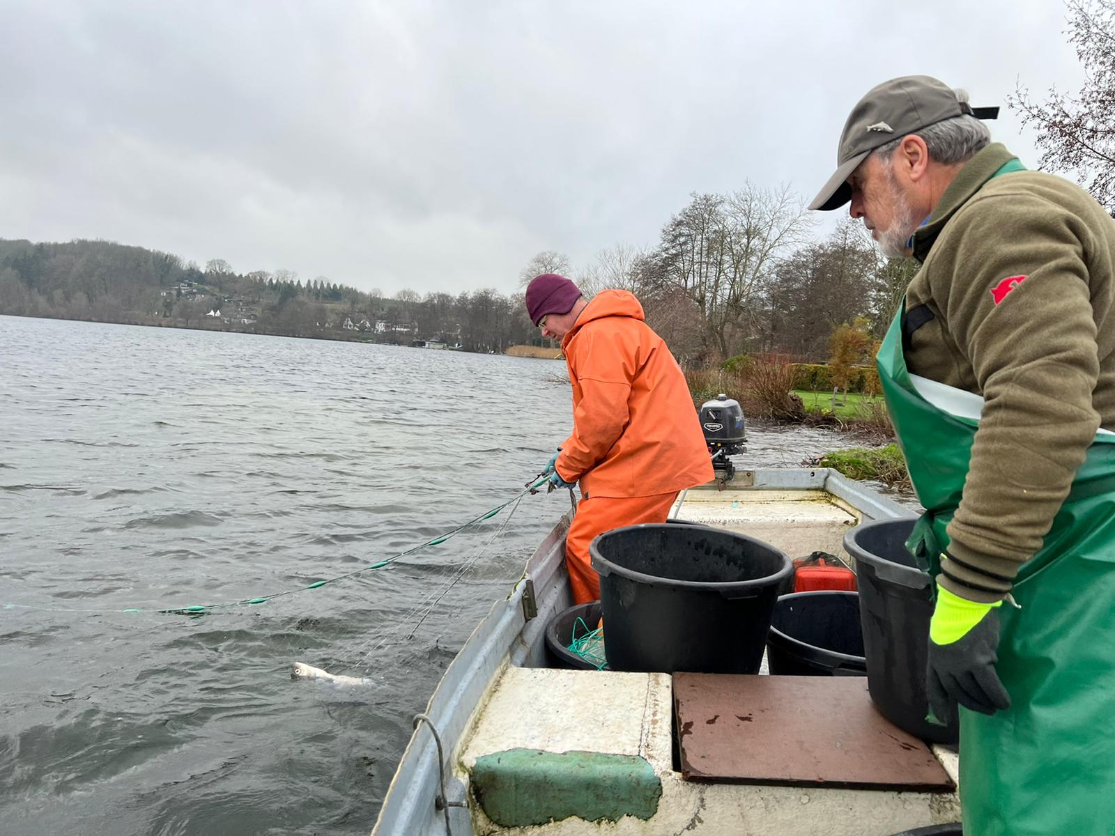 Mitte Dezember 2021 haben wir dem Fischermeister Helmut Schwarten gestattet, in unserem Beisein, große Maränen (Edelmaränen) zu Laichgewinnung zu fangen. Der einzige Fangtag erbrachte dabei 4 weibliche und 10 männliche Maränen in einem Gewicht von 2-3 kg. Nur die weiblichen Maränen wurden zum Abstreifen entnommen. Wir beziehen seit mehr als 20 Jahren Brütlinge für den Maränenbesatz beim Fischermeister Schwarten.
